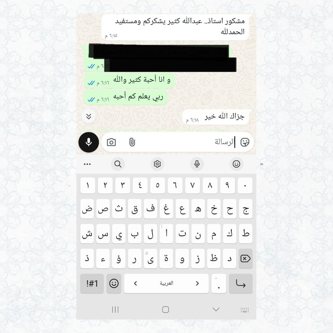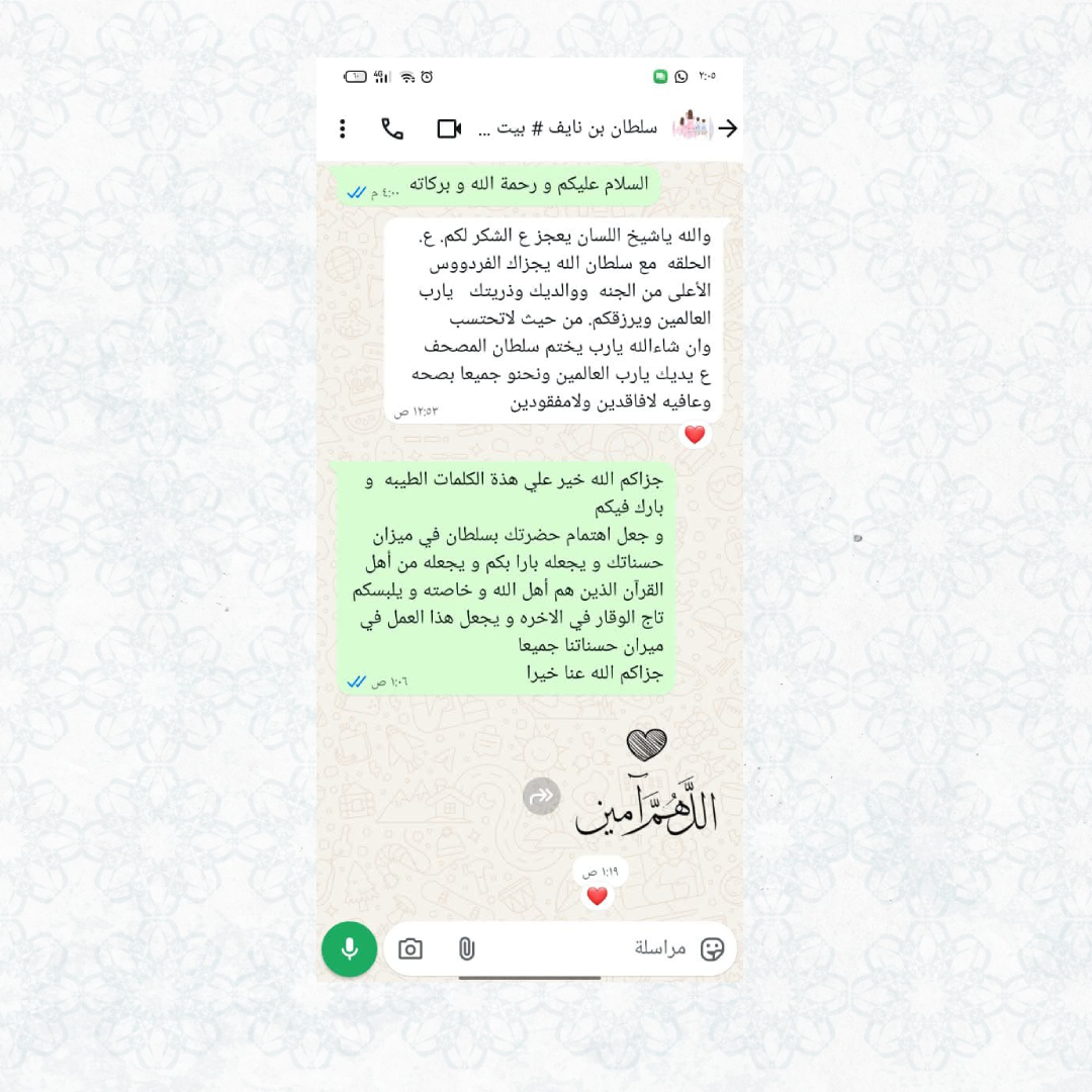 Contact us via WhatsAppWe seek to serve the Book of Allah by enabling our students to correct their recitation independently, building a close relationship with the Holy Quran in understanding, reflection, and action, and graduating a Quranic generation that carries the morals of the Quran and spreads its light across the horizons.